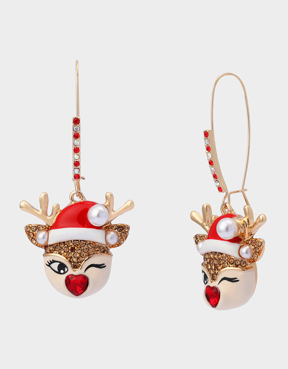 Festive brooch featuring reindeer adorned with playful Santa hat, red vibrant bow and minimal pearls for a merry look. Brooch has a pin closure. Made from metal, glass crystal, polyester and imitation pearl.