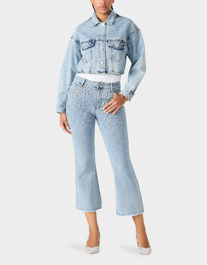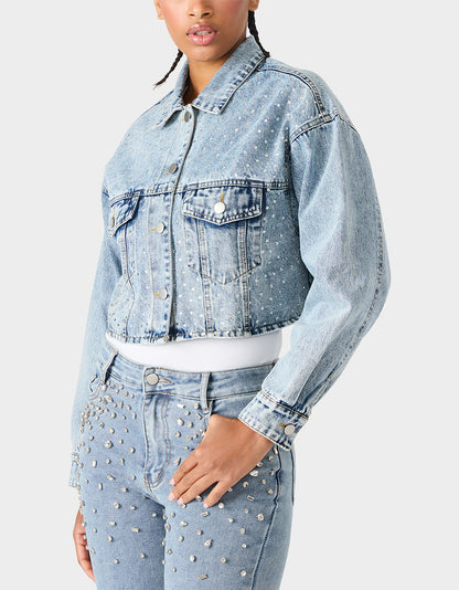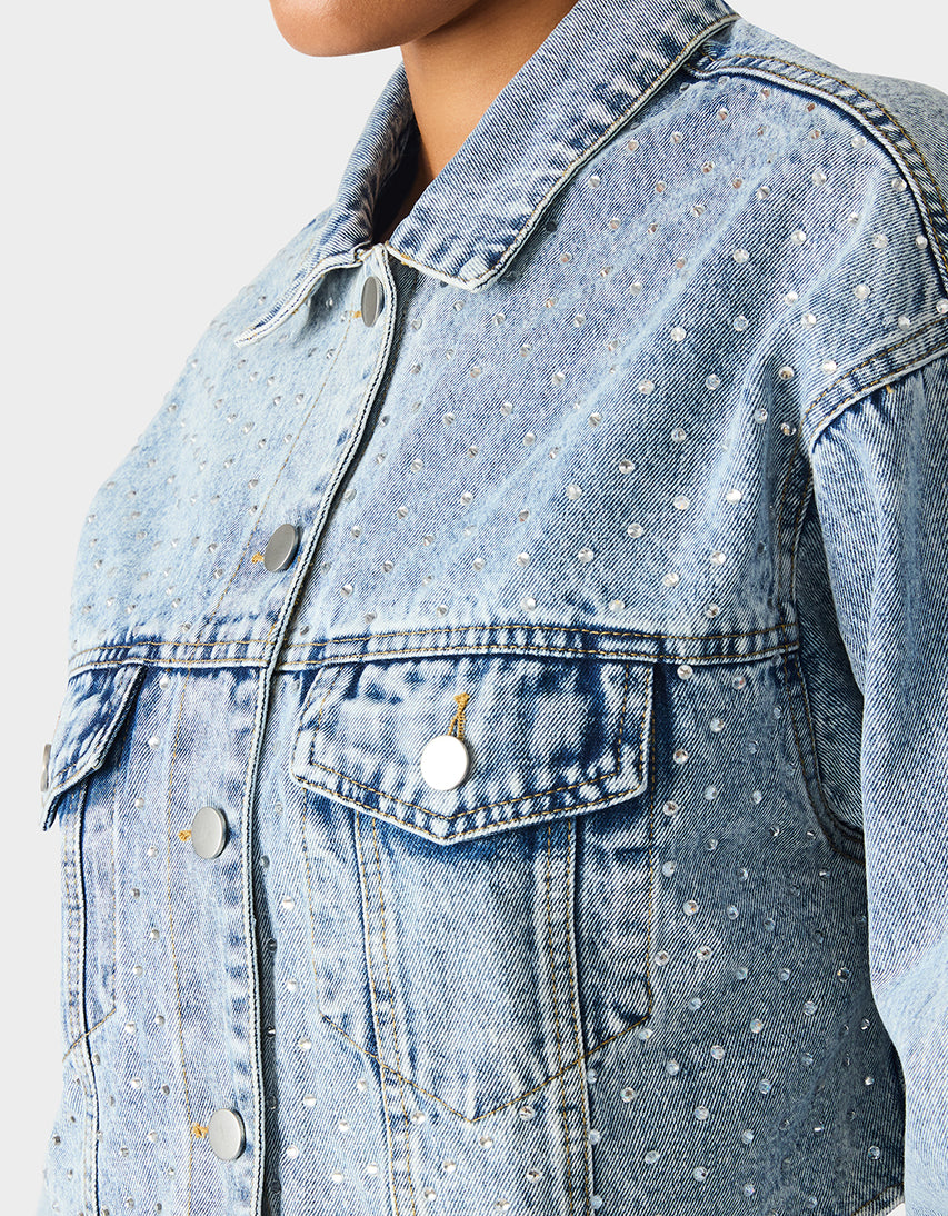 Add a dash of sparkle to your wardrobe with this playful long-sleeved SPARKLE DENIM jacket, adorned with dazzling rhinestone embellishments. Perfect for turning everyday outfits into eye-catching statements, it combines classic denim comfort with a fun, glamorous twist. Whether layered over your favorite tee or dressed up for a night out, this jacket brings a lively sparkle to any look.