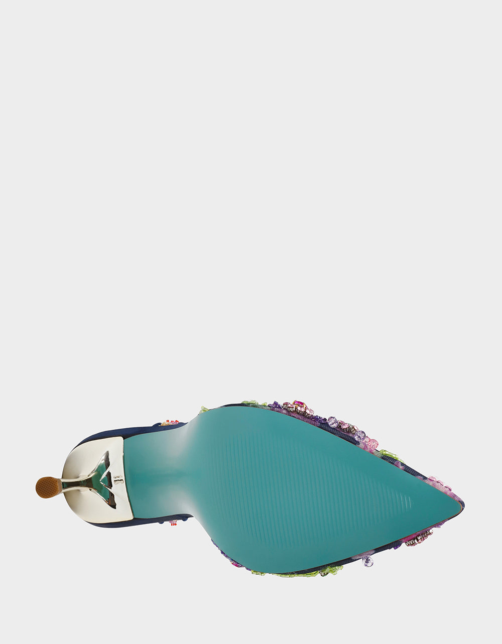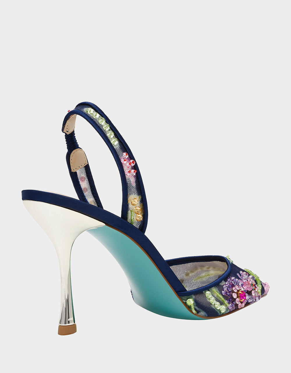 Sophisticated and chic, Betsey Johnson's new VELMA pump is encrusted with jewels and beading! A rich design is made wearable with a delicate sling back strap and padded footbed.